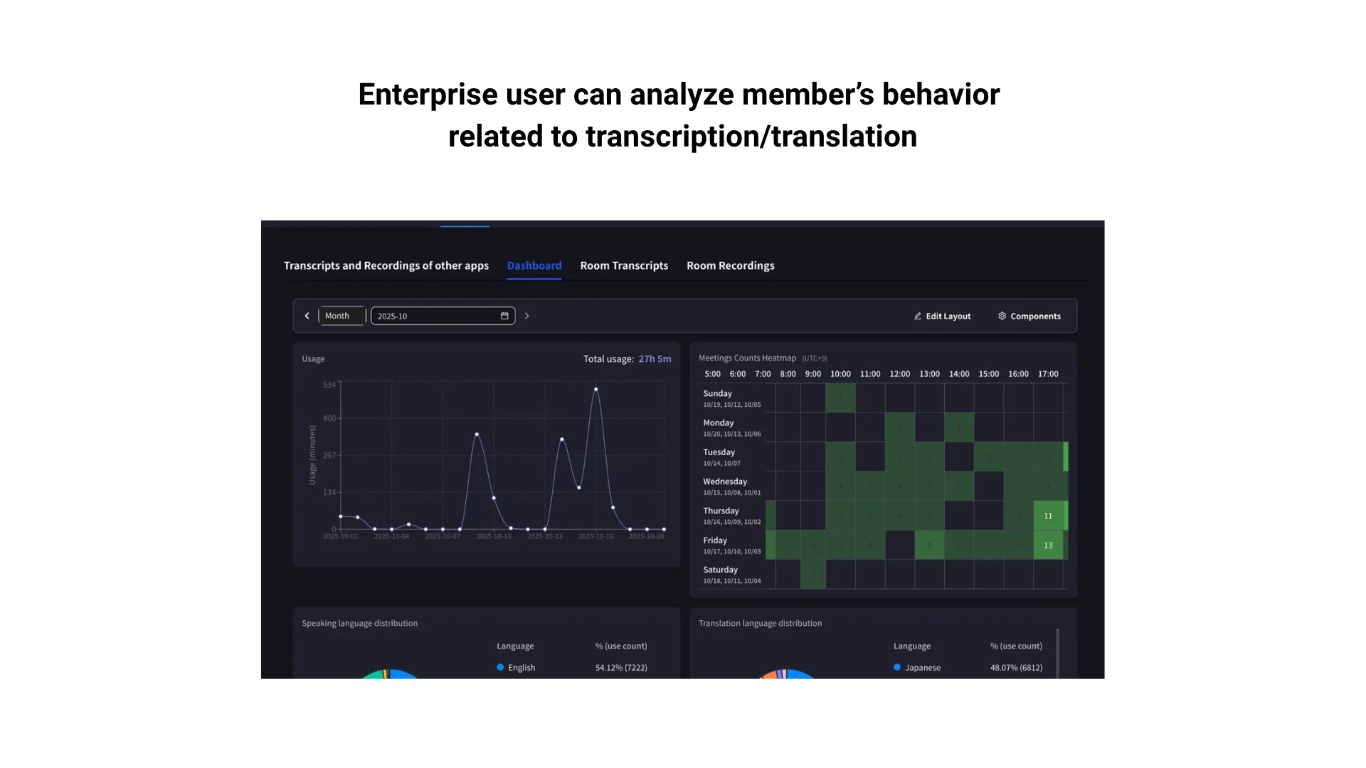 Managers can now access a powerful dashboard that provides valuable insights into workspace activity and usage patterns. The dashboard displays your total usage time for the selected month, with a detailed timeline graph showing daily usage fluctuations. The Meetings Counts Heatmap visualizes when your team is most active throughout the week, with time slots marked in UTC+9, making it easy to identify peak meeting hours and collaboration patterns. Additionally, the dashboard breaks down speaking and translation language distributions, showing the percentage and count of each language used across your workspace. This data-driven overview helps managers optimize team schedules, understand communication preferences, and make informed decisions about resource allocation.