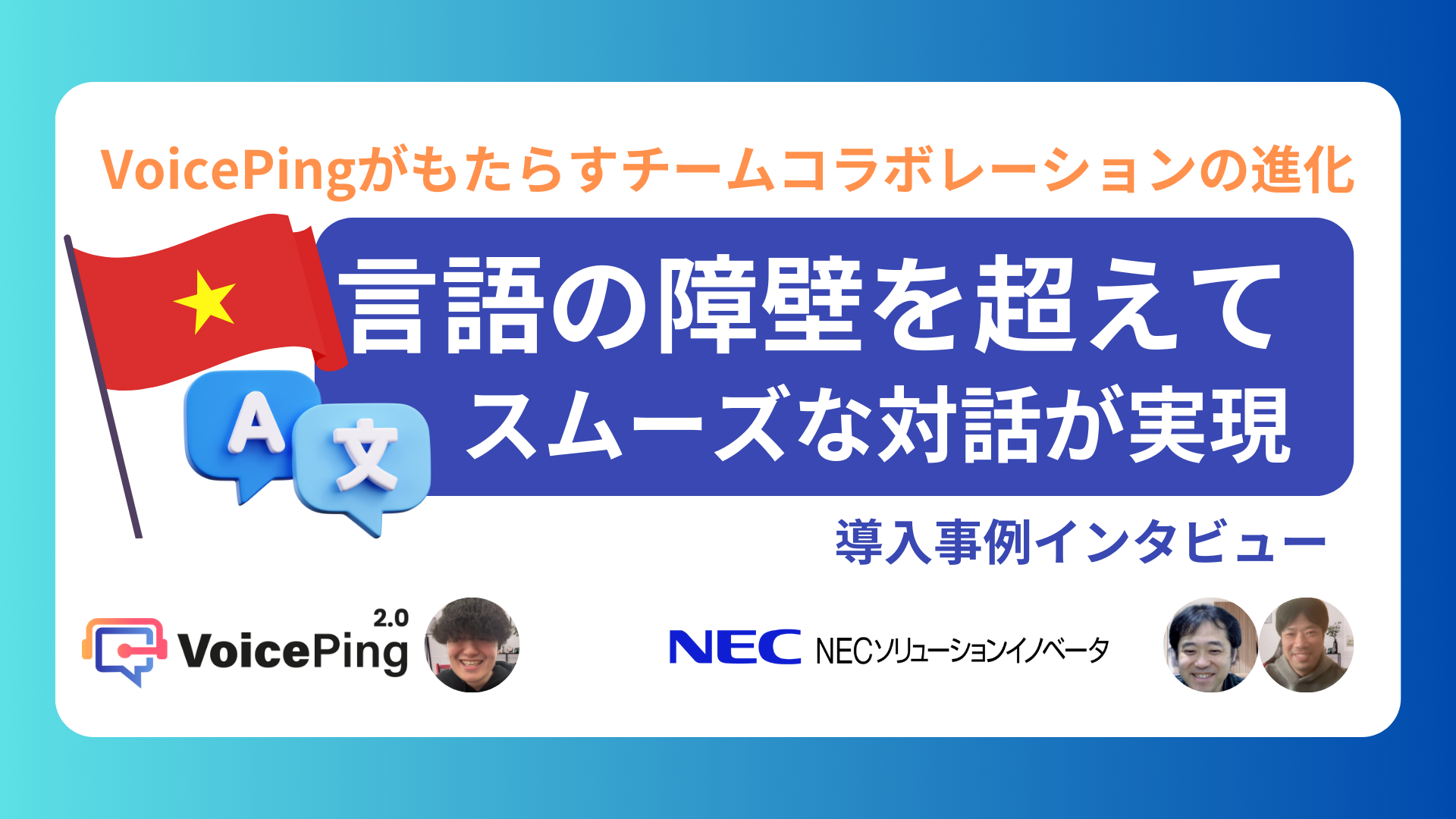 近年はビジネスのグローバル化に伴い、当然チームもグローバルになりつつありますが、それと同時に言語的な障壁が発生し、スムーズなコミュニケーションを取りづらくなる原因になっています。今回は、ベトナムの現地メンバーとのコミュニケーションのためにVoicePingを導入した、NECソリューションイノベータで実際にVoicePingを利用されている齊藤さんにお話をお伺いしました。