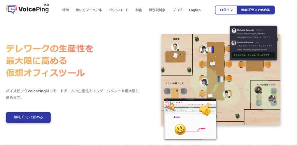 シンプルで直感的な操作が特徴のバーチャルオフィスツールVoicePingでは、会議室からワンクリックでメンバーを招待してスピーディに会議を開始できます。
